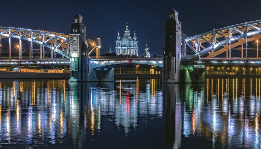 View from water. Night illumination transforms it into a "medieval castle over the Neva." Similar in silhouette to Tower Bridge in London. And the view of the opened bridge wings and illuminated domes of Smolny — a classic St. Petersburg contrast of baroque and industrial style.