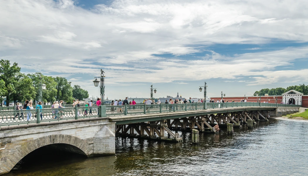 The first bridge in St. Petersburg's history can be considered a small and shaky pontoon bridge over which the builders of the fortress on Hare Island carried earth. Now we know it as Ioannovsky Bridge. It spans the Kronwerk Strait and connects Hare Island and Petrograd Island.