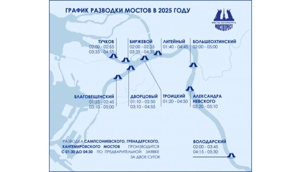 The current bridge opening schedule can be seen on the website: Mostotrest-SPb.