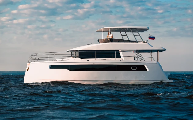 Catamaran "Torano 44 A" is the future on the water. The minimalistic design, clean lines and ultra—modern silhouette attract the eyes, and the main advantage is the double-hull stability. It doesn't get seasick even in the swell of the Gulf of Finland.